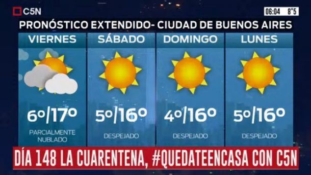 El Servicio Meteorológico Nacional (SMN) anticipa para este viernes en la Ciudad de Buenos Aires y alrededores una jornada muy agradable con pocas nubes y un arranque fresco, aunque la tarde presentará muy buenas condiciones climáticas.