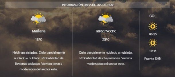 "Probabilidad de lloviznas aisladas por la mañana y de chaparrones por la tarde noche" es el pronóstico del Servicio Meteorológico para este viernes. La temperatura estaría entre los 18 y los 25 grados.
