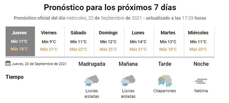 Las precipitaciones cesarían para el viernes, en el inicio del fin de semana, para cuando se prevén neblinas y cielo parcialmente nublado; y marcas térmicas que oscilarán entre 9 y 21. Las condiciones serán similares para el sábado.