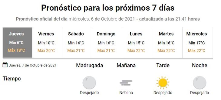 De esta manera, la jornada tendría cielo despejado, una mínima de 6 grados y una máxima de 18.