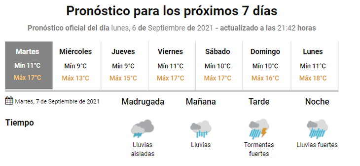 El Servicio Meteorológico Nacional espera una jornada con lluvias durante todo el día, con una mínima de 11 y una máxima de 17 grados.