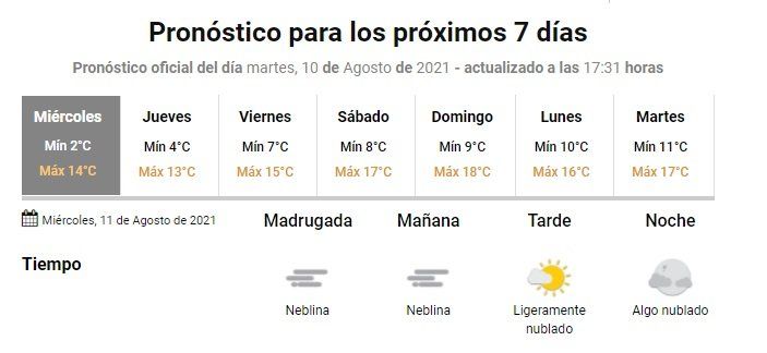 De esta manera, se prevé neblinas para la madrugada y la mañana, y cielo ligeramente nublado a algo nublado para la tarde y noche. La temperatura irá de 2 a 14 grados.