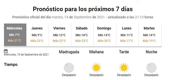 De esta manera, el miércoles se presenta sin probabilidades de precipitaciones, con cielo despejado para todo el día y marcas térmicas que oscilarán entre una mínima de 7 y una máxima de 21 grados.