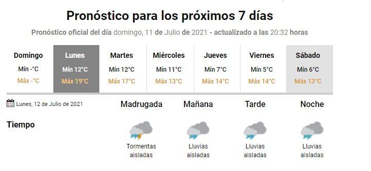 Para este lunes se esperan tormentas y chaparrones durante todo el día, vientos del noreste cambiando al norte y marcas térmicas que oscilarán entre los 12 y los 18 grados.