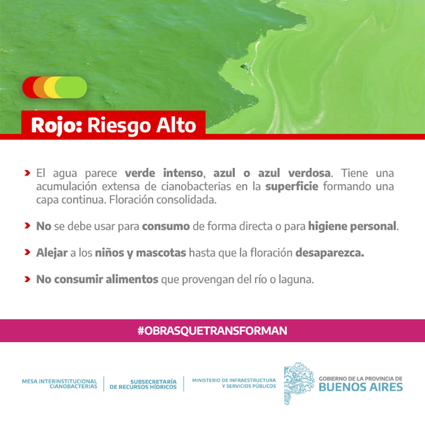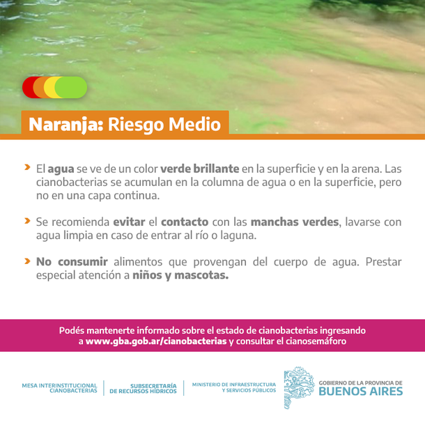 Desde la Subsecretaría de Recursos Hídricos se indicó que el cianosemáforo se puede consultar en gba.gob.ar/cianobacterias dónde también se encuentra disponible material descargable para difusión sobre qué son y cómo actuar ante su contacto.