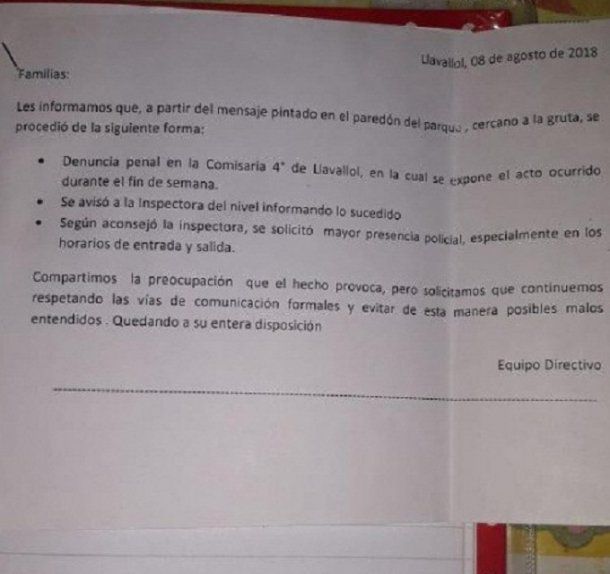 La escuela hizo la denuncia penal en la Comisaría 4ta. y exige mayor presencia policial en los horarios de entrada y salida y en todos los alrededores. Además, informaron por una nota a todos los padres y dieron aviso a la Inspectora distrital, que también recomendó solicitar mayor presencia policial.
