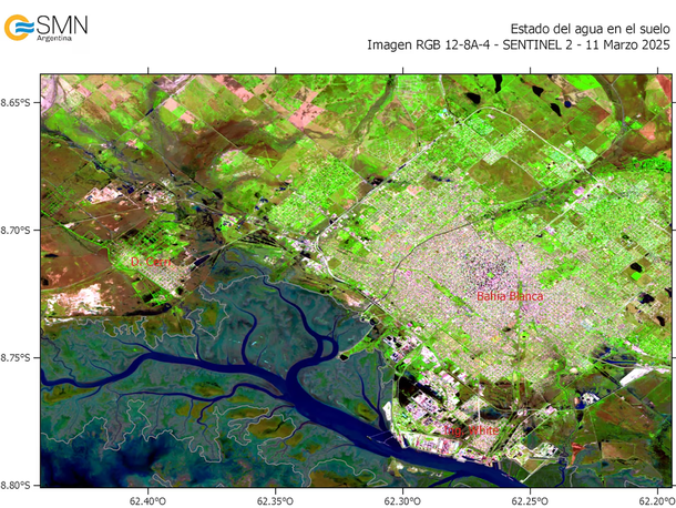 Sentinel-2, el satélite de la Agencia Espacial Europea al que tiene acceso el Servicio Meteorológico Nacional (SMN), capturó el 11 de marzo pasado una imagen que da cuenta del nivel del agua aún días después de la tormenta.