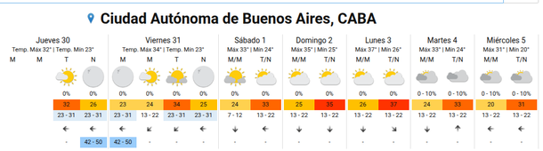 Para este jueves, estaba pronosticada una temperatura máxima de 32 grados. Aunque no se llegó a esa térmica, sí se espera que las siguientes jornadas sean más difíciles en lo que a clima respecta. Según el SMN, este viernes el termómetro alcanzará una máxima de 34 grados, en tanto que el sábado y domingo registrará una suba hasta los 33 y 35 grados, respectivamente.