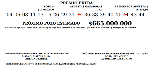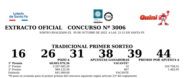 Para controlar la boleta del Quini 6 siempre hay que utilizar el extracto oficial para no tener ningún tipo de dudas: todos los números del sorteo del domingo 30 de octubre de 2022.