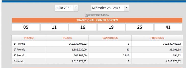 El afortunado ganó con los números 05, 19, 11, 41, 16 y 25.