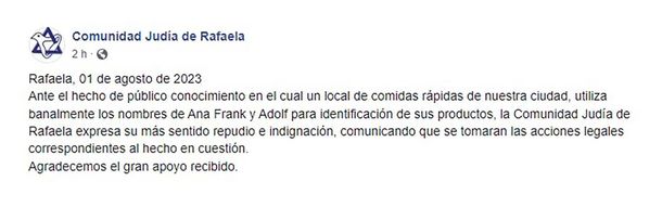 La Comunicad judía de Rafaela también repudió la decisión del restaurante con un comunicado en Facebook: “Ante el hecho de público conocimiento en el cual un local de comidas rápidas de nuestra ciudad utiliza banalmente los nombres de Ana Frank y Adolf para identificación de sus productos, la Comunidad Judía de Rafaela expresa su más sentido repudio e indignación, comunicando que se tomaran las acciones legales correspondientes al hecho en cuestión”.