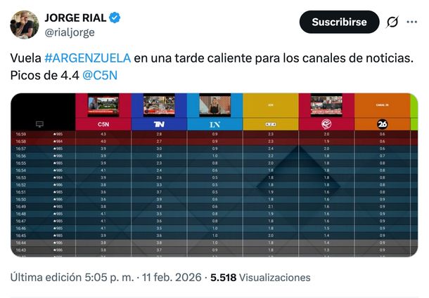“Vuela #ARGENZUELA en una tarde caliente para los canales de noticias. Picos de 4.4 @C5N”, posteó el periodista, acompañando el mensaje con una planilla comparativa de las mediciones del minuto a minuto.