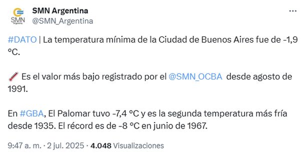 Servicio Meteorológico Nacional (SMN) confirmó que la Ciudad de Buenos Aires alcanzó este miércoles 2 de julio una temperatura mínima de -1.9 °C, el valor más bajo registrado por el Observatorio Central desde agosto de 1991.