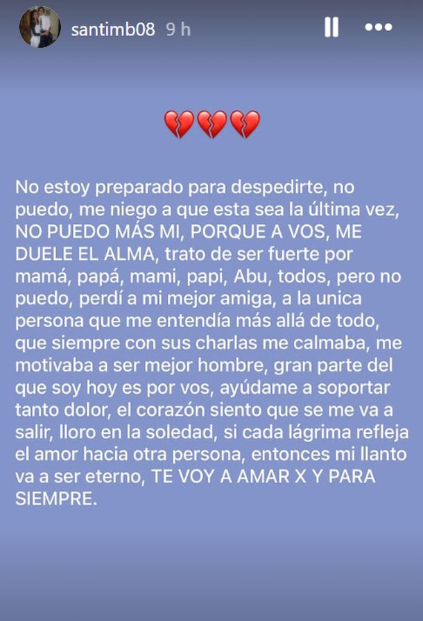 "No estoy preparado para despedirte, no puedo, me niego a que esta sea la última vez. No puedo más, Mi, por qué a vos, me duele el alma", expresó el joven en sus historias de Instagram, donde también señaló: "trato de ser fuerte por mamá, papá, mami, papi, Abu, todos, pero no puedo".