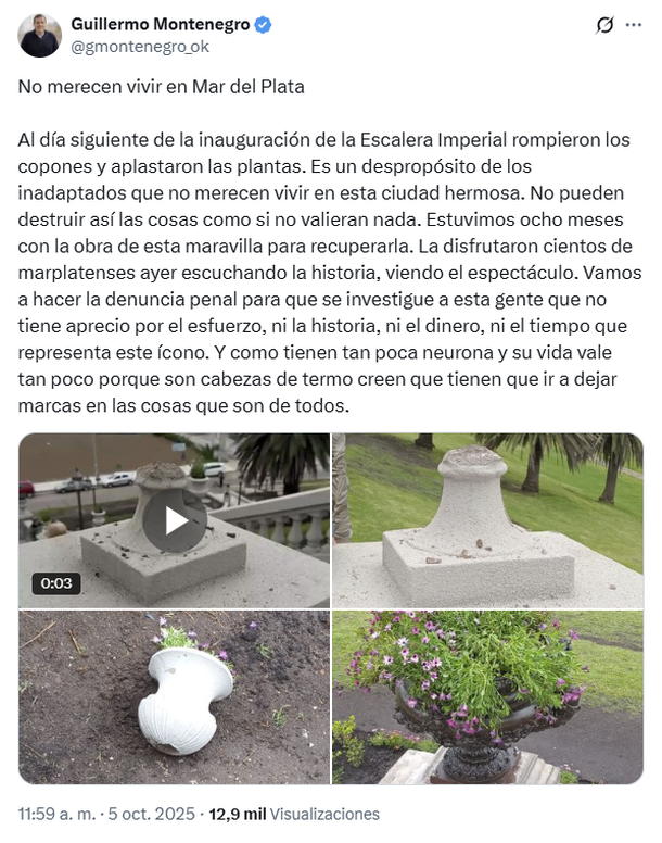 “No merecen vivir en Mar del Plata”, expresó Montenegro al denunciar públicamente los daños a la obra: “Al día siguiente de la inauguración de la Escalera Imperial rompieron los copones y aplastaron las plantas. Es un despropósito de los inadaptados que no merecen vivir en esta ciudad hermosa. No pueden destruir así las cosas como si no valieran nada. Estuvimos ocho meses con la obra de esta maravilla para recuperarla”, continuó.