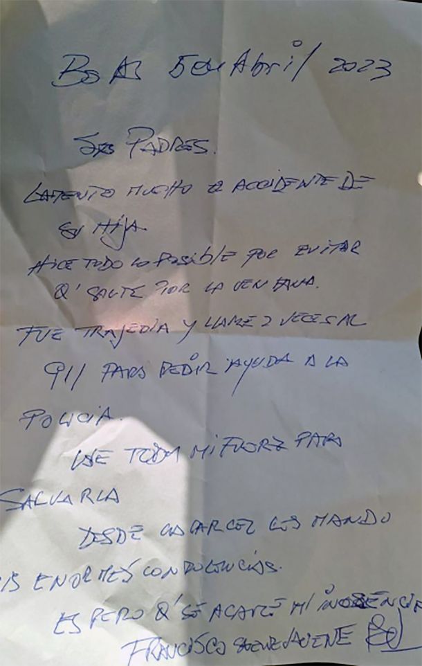 "Lamento mucho el accidente de su hija", comienza la misiva enviada por el acusado desde la cárcel, a través de su abogado, Rafael Cúneo Libarona, con fecha del 5 de abril pasado.
