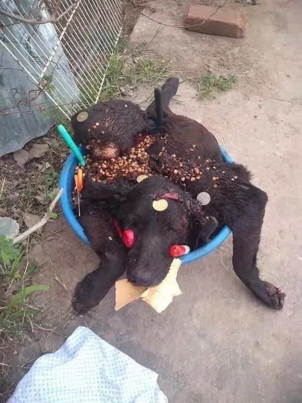 Entre los hallazgos, descubrieron gatos muertos colocados en cruces de madera, así como un perro negro sin vida con cuchillos clavados en su cuerpo.