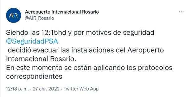 El aeropuerto informó hoy a través de su cuenta de Twitter que a las 12.15 sus instalaciones fueron evacuadas "por motivos de seguridad" y que se estaban aplicando "los protocolos correspondientes".