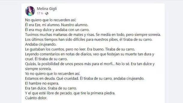“Vivo en Casilda, viajo todos los días a dar clases porque amo la escuela pública y lo que hago. Y en esa imagen terrible que vi de Ezequiel vi a otros pibes del barrio. No quiero que se queden con eso, porque él era otra cosa”, pidió.