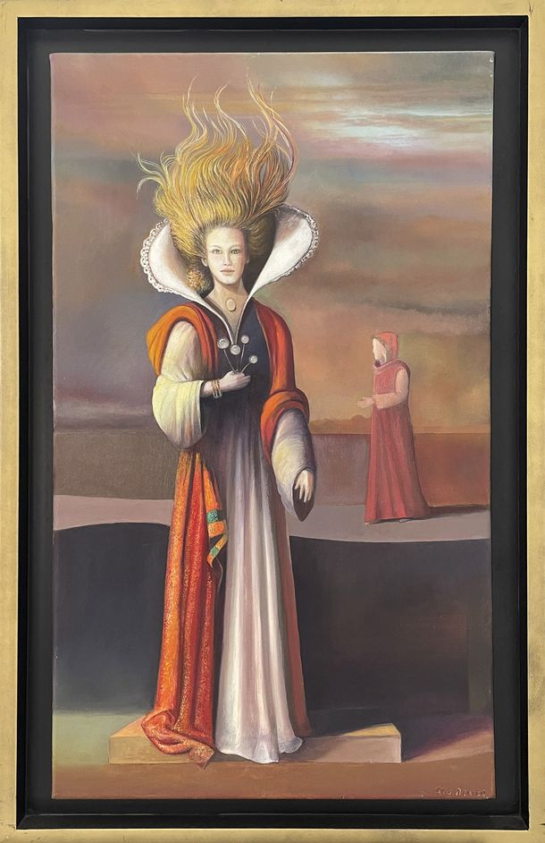 “Junto a Virgilio y Beatriz somos acompañantes atemporales en el camino de sabios matices y formas que manifiesta el artista. La mujer, el desnudo, el drama, un paisaje inquietante surgidos del color y de la luz son escenografías propias del surrealismo y la metafísica. De allí emanan, las imágenes expuestas, un aura de ensoñación que atemporaliza la escena e indetermina el lugar, permitiendo ver un espectáculo que atraviesa el tiempo y la conciencia.”