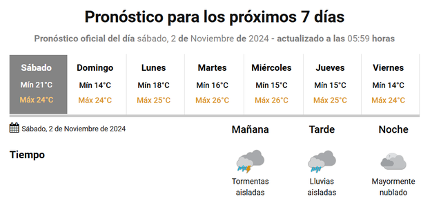 Durante la madrugada y la mañana se espera cielo total a mayormente nublado, con tormentas y chaparrones por la tarde. En cuanto a las temperaturas, se mantendrán todavía relativamente altas, ya que la máxima alcanzará los 24°.