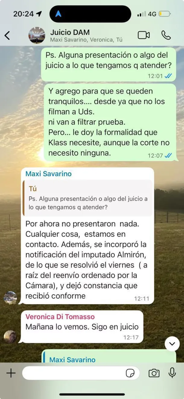 “Buenos días. Me habló Klass y me preguntó por el tema de la cámara que autorizó July. Estuvimos hablando del tema y tenemos que conversar. Ahora estoy en juicio, pero si ustedes pueden me avisan y hago un cuarto intermedio para no demorarnos mañana antes de la audiencia. July, si tenés una autorización de la Corte, por favor, mostránosla, así se agrega a la causa y evitamos problemas”, fue el mensaje que mandó Di Tommaso a las 11.55.