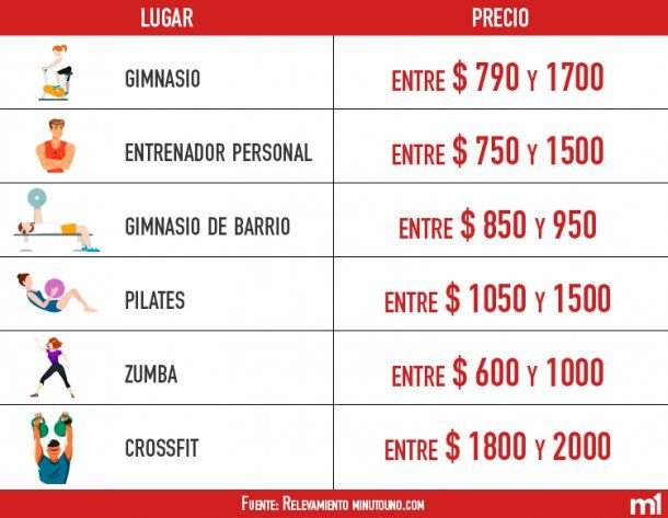 En la mayoría de los gimnasios hacen rebajas si se pagan varios meses juntos. Casi siempre, se abonan con tarjeta de crédito en la misma cantidad de cuotas que se adelantan. Los gimnasios de cadena van desde los $1500 hasta los $1800 por mes. Mientras que en los gimnasios de barrio los precios van desde $850 hasta $950, y en algunos casos hacen descuento si se paga en efectivo.