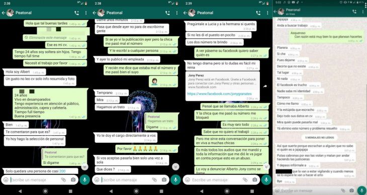 "Pues dejame decirte que no existe tal lugar ni nada. El Facebook es trucho, nadie sabe mi identidad. Tampoco cómo me llamo, y la estúpida que escrachó dejó todos sus datos en el CV. Mira quién puede pasarla mal. Ya elimino este número y problema resuelto", escribió la persona.