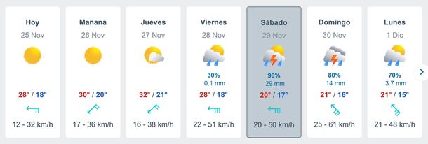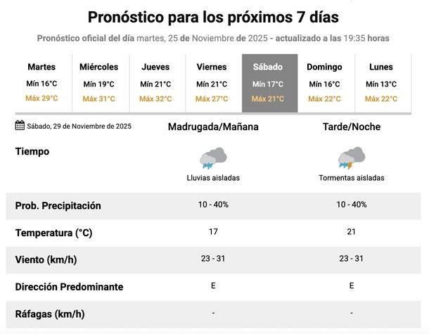 Para el organismo nacional, la fecha de regreso de las precipitaciones será el sábado, con mal tiempo durante toda la jornada: lluvias aisladas en la madrugada y mañana y tormentas aisladas en la tarde y noche; con marcas de entre 17 y 21 grados.