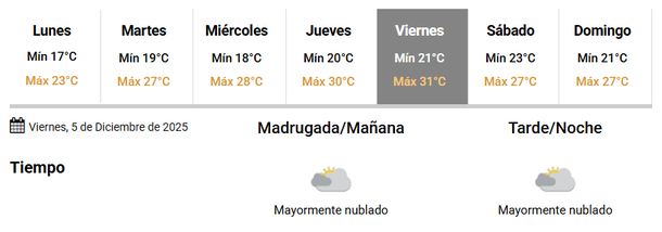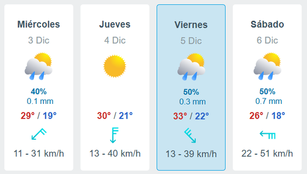 De acuerdo a lo señalado por el organismo nacional, tanto el jueves 4 de diciembre como el viernes 5 el termómetro estará por encima de los 30 grados. El resto de las jornadas, las máximas rondarán los 27 y 28 grados, en lo que se cree que es un breve anticipo al verano, que llegará el próximo 21 de diciembre.