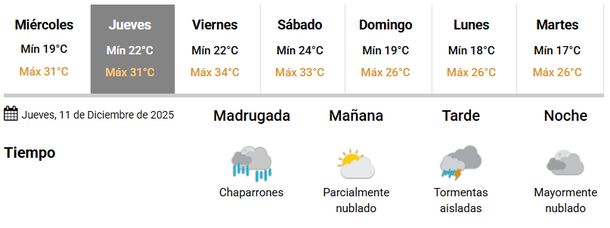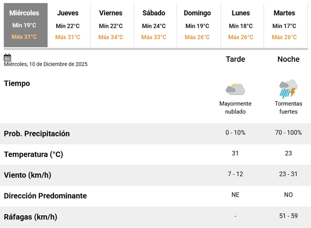 Además, hay que mencionar que las lluvias y tormentas se extenderán a la jornada del jueves, que contará con una temperatura máxima de 31 grados. Las mismas serán durante la madrugada, cuando se esperan chaparrones, y hacia la tarde, donde aparecerán algunas tormentas aisladas.