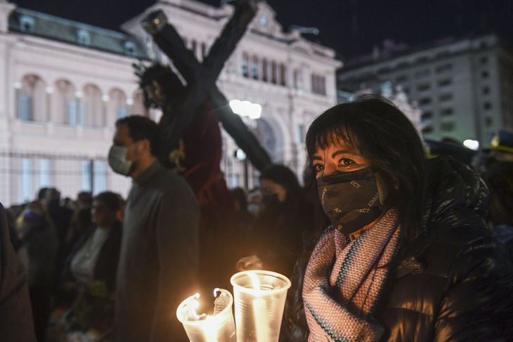 Centenares de católicos participaron esta noche del tradicional Vía Crucis en la Avenida de Mayo que volvió a realizarse después tras dos años de pandemia de coronavirus.
