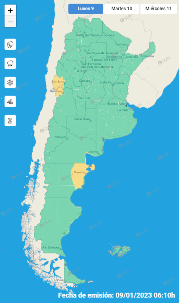 Zonas de Chubut, Río Negro, Mendoza y San Juan se encuentran esta mañana bajo alerta amarilla por tormentas de variada intensidad, que pueden estar acompañadas por ráfagas, ocasional caída de granizo, importante actividad eléctrica y abundante caída de agua en cortos períodos, informó el Servicio Meteorológico Nacional (SMN).