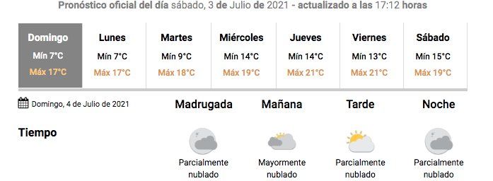 Para este domingo el Servicio Meteorológico Nacional anuncia una temperatura mínima de 7 grados, mientras que la máxima, dependiendo el lugar donde se está dentro de la zona del AMBA, se ubicarán entre los 17 y 20 grados.