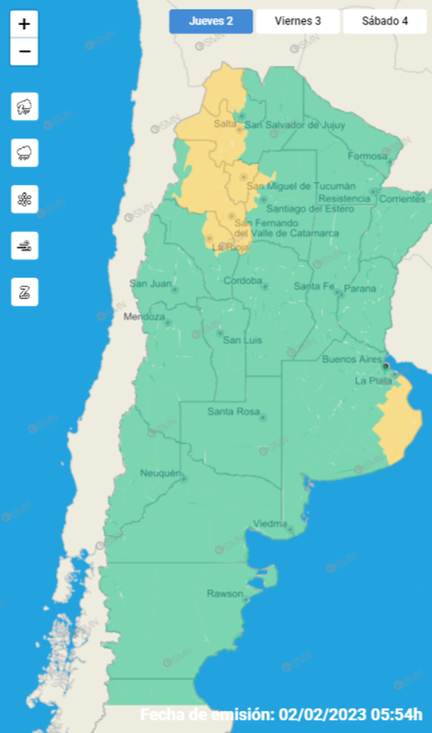 Asimismo, el alerta por tormentas fuertes se prevé también para las zonas riojanas de Arauco, Capital, Castro Barros y Sanagasta.
