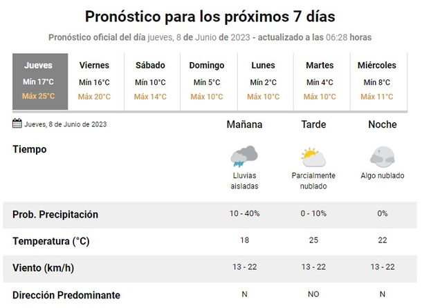 El Servicio Meteorológico Nacional (SMN) prevé para este jueves 8 de junio vientos moderados a intensos del norte con ráfagas, una temperatura que irá de los 17 a los 25 grados y lluvias aisladas por la mañana en la Ciudad y el conurbano bonaerense.