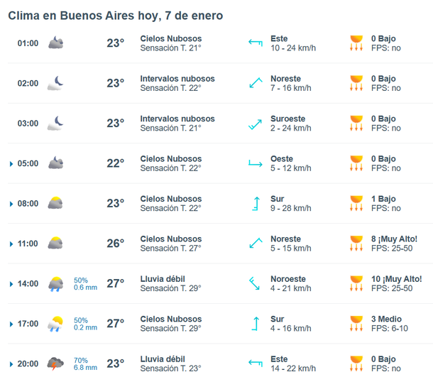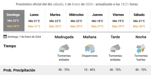El Servicio Meteorológico Nacional (SMN) actualizó su pronóstico y prevé para este domingo 7 de enero vientos leves a moderados del Sudeste -rotando luego al Este durante la mañana-, una temperatura que irá de los 22 a los 30 grados y tormentas aisladas en todo el día. Además, el SMN anuncia tormentas fuertes durante la noche.