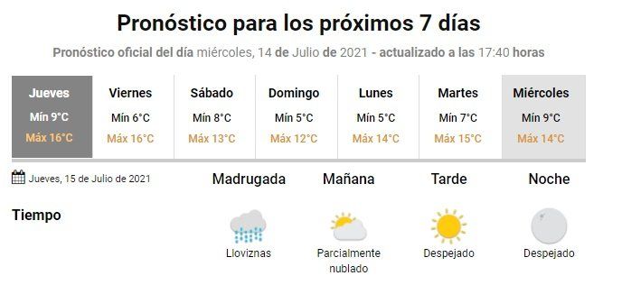 Para los próximos días, el SMN anticipa un viernes con 6 grados de mínima y 16 de máxima; y cielo ligera a algo nublado. Para el sábado, más nubes y temperaturas entre 8 y 13 grados.