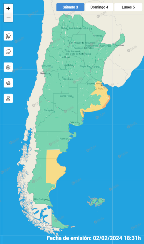 La alerta amarillo es para casi todo el este de la provincia, desde el norte hasta Carmen de Patagones, que tienen alerta amarillo.