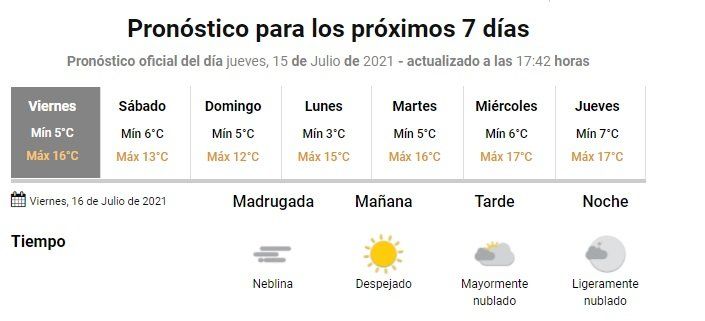 Para el fin de semana, el SMN anticipa un sábado con 6 grados de mínima y 13 de máxima; y cielo parcialmente nublado con probabilidad de chaparrones. Para el domingo, más nubes y temperaturas entre 5 y 12 grados.