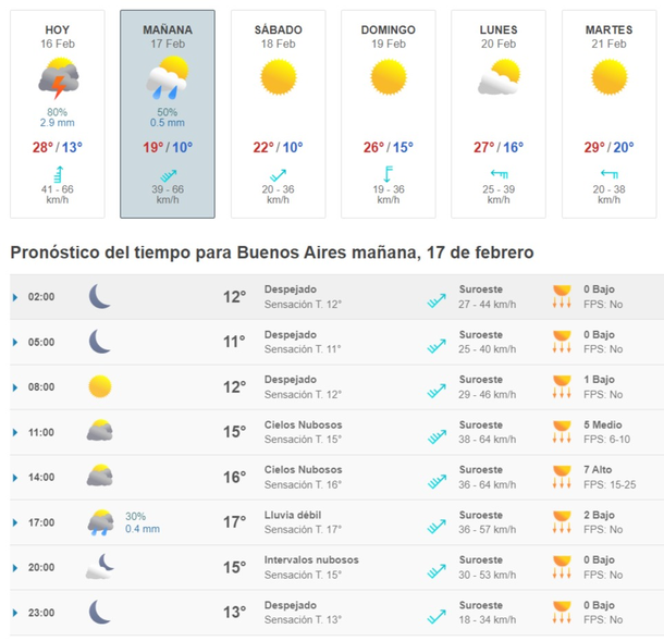 El sitio Meteored estima una temperatura mínima de 10 para la mañana del viernes 17 de febrero en Buenos Aires. Idénticas condiciones para el sábado aunque soleado con una máxima que trepará a los 22.