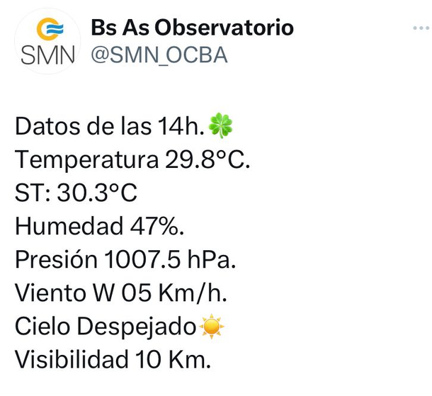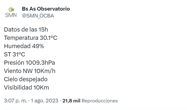 Pocos minutos después de las 15 horas del martes 1 de agosto de 2023 la estación meteorológica perteneciente a la red de observaciones del Servicio Meteorológico Nacional de la Ciudad de Buenos Aires registró una marca térmica de 30.1 grados.