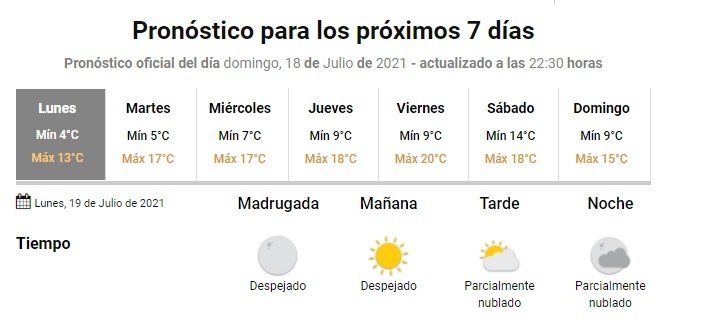 La semana continuará con un martes con cielo algo nublado y marcas térmicas que irán de 5 a 17 grados; mientras que el miércoles tendrá cielo ligera a parcialmente nublado y temperatura en ascenso, con una mínima de 7 y una máxima de 17.