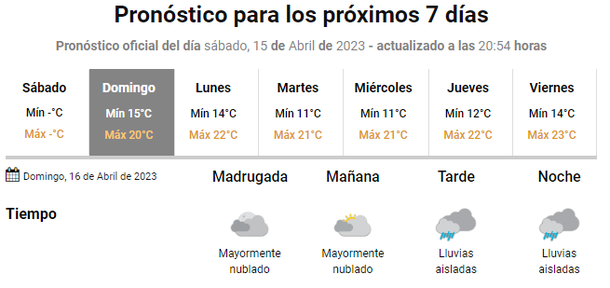 Según el pronóstico del tiempo, las temperaturas de este domingo oscilarán entre los 15 y los 20 grados y se espera cielo mayor a parcialmente nublado, por lo que se aguardan lluvias aisladas durante la tarde y la noche