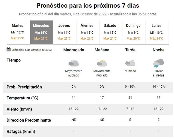 Para el jueves se espera cielo nublado, vientos leves de direcciones variables y una temperatura que oscilará entre los 14 y los 23 grados.