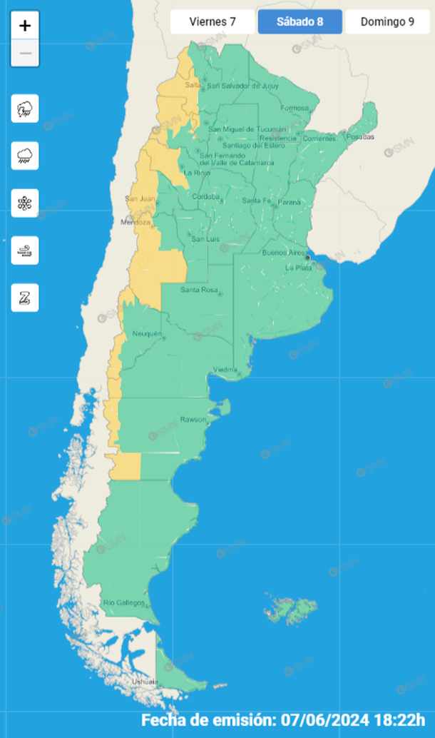 El Servicio Meteorológico Nacional (SMN) emitió sendas alertas amarillas para la jornada de este sábado 8 de junio en 10 provincias, por lluvias, nevadas y sobre todo por vientos fuertes, entre ellos el Zonda.