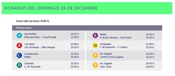 Subtes y Premetro: funcionará de 8 a 21, en tanto que el lunes 25 funcionarán de 8 a 21 o 22, según corresponda el horario del último tren de cada línea.