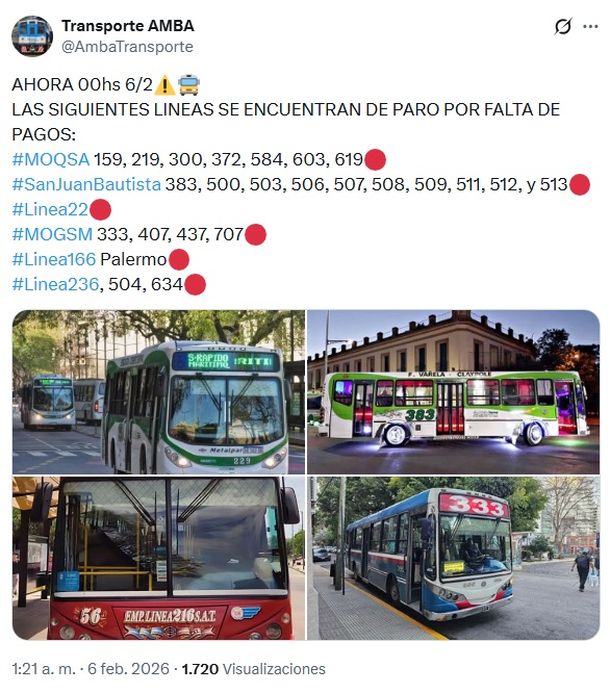 Un paro de colectivos se lleva a cabo este viernes 6 de febrero en el Área Metropolitana de Buenos Aires (AMBA). La medida fue anunciada el jueves por la noche en el marco de un conflicto salarial. El cese de actividades, que comenzó a regir a la medianoche, impactó en varias líneas y muchas personas que deben viajar se preguntar cuáles son.