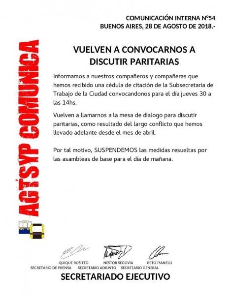 "Vuelven a llamarnos a la mesa de dialogo para discutir paritarias, como resultado de cuatro meses de conflicto que hemos llevado adelante con aperturas de molinetes, mesas de café con usuarios y paros", dijo en un comunicado la Asociación Gremial de Trabajadores del Subte y Premetro - AGTSyP.