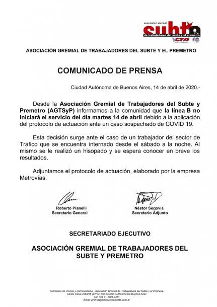 A través de un comunicado la Asociación Gremial de Trabajadores del Subte y Premetro (AGTSyP) anunció el lunes por la noche que: “la línea B no iniciará el servicio del día martes 14 de abril debido a la aplicación del protocolo de actuación ante un caso sospechado de Covid-19”.